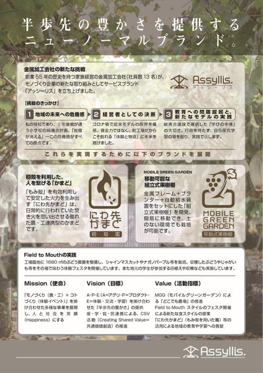 アッシーリスの活動は、製品開発にとどまらず、地域の農業体験、探究学習、高校生との協働など、多様な実践と結びついています。シャインマスカットなどの収穫体験や、米づくりの探究学習などの「Field to Mouth(採って、食べる)」の取り組みでは、地域の方々や高校生が参加し、ものづくり企業が地域を支える“社会装置”として役割を果たす可能性を広げてきました。今回の選定は、こうした実践が「地域を開くデザイン」として認められたものでもあります。